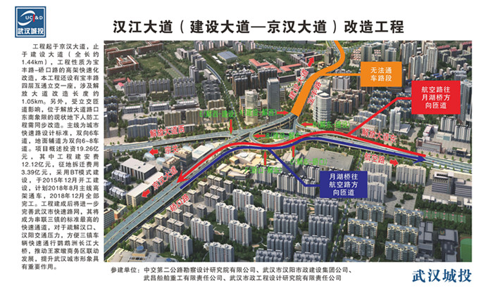 整個(gè)漢江大道工程是常青路-硚口路-江漢四橋快速通道,為武漢主城區(qū)快速路的重要組成部分,南接南三環(huán),北至北三環(huán)并與機(jī)場(chǎng)高速連接。