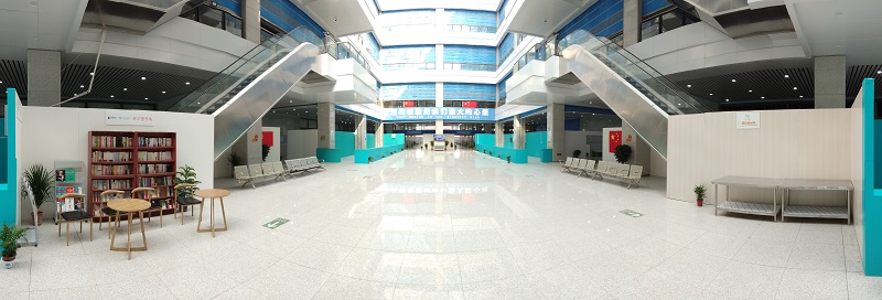充分利用20米高凈空的寬敞中庭,在周邊增加射燈,設置圖書角、觀影區(qū)和小廣場等設施,為病患打造舒適的環(huán)境;