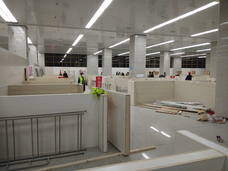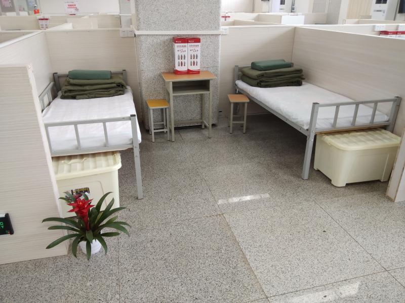 作為施工單位,中鐵大橋局七公司、武漢城投下屬譽城建設集團兩家單位勠力同心,高效協(xié)作:一輛輛運輸床架、床板、被子、日用品等物資的車輛陸續(xù)抵達,雙方工人們不分彼此,互相幫助,快速有序地裝卸。走進施工現(xiàn)場,兩個單位突擊隊的兩面鮮紅的旗幟一左一右,格外醒目。用了不到3天時間,他們就完成了材料采購運輸進場、隔板切割拼裝以及1956張床位的鋪設和配套生活用品擺設等工作。