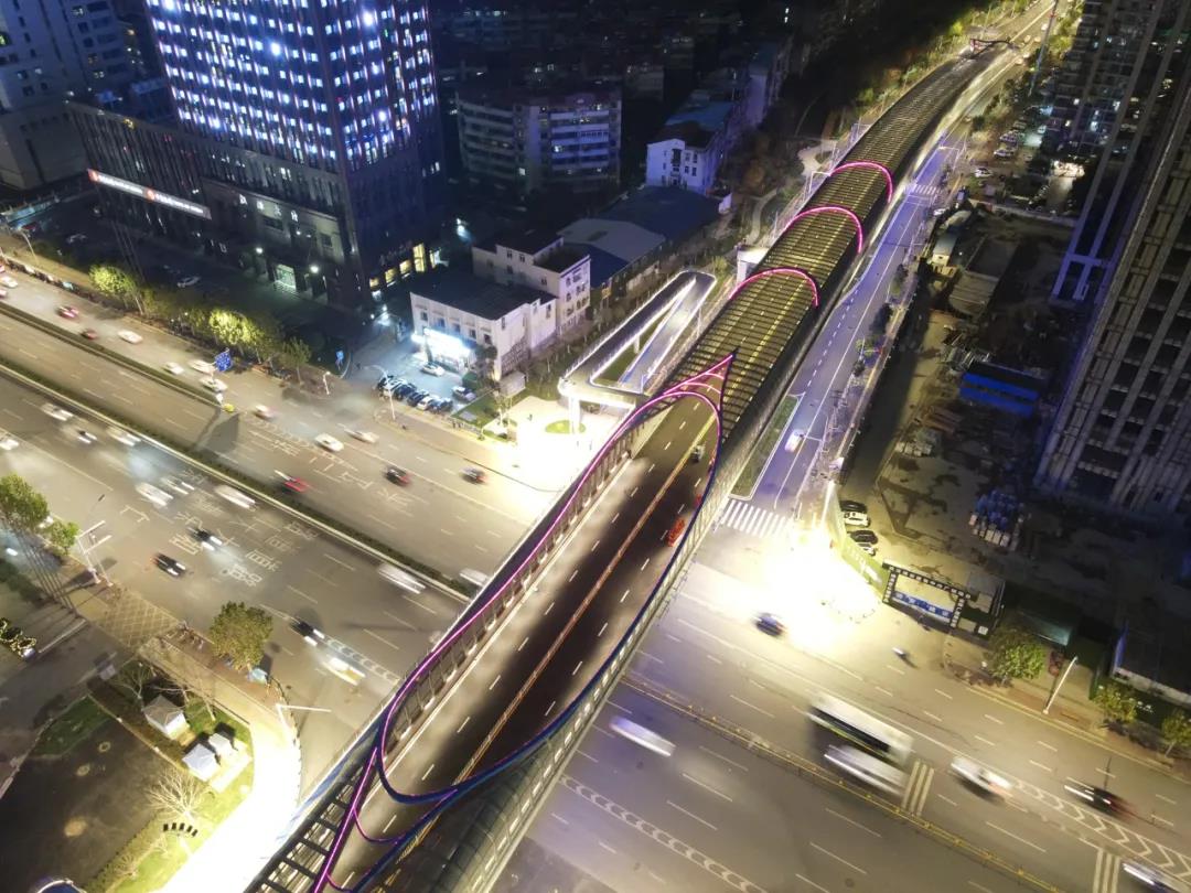 沙湖大道跨徐東大街立交工程是改善民生的重點工程,西起秦風(fēng)路,東至楊園南路,全長1.13公里,其中橋梁長475米,采用“主線橋+地面輔道”方式上跨徐東大街。沙湖大道跨徐東大街立交工程高架橋是人行過街天橋和跨線高架橋結(jié)合的功能橋,主線橋梁優(yōu)美的藍色曲線與聲屏障韻律感構(gòu)架融為一體,猶如鯤鵬展翅一般。