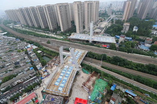 為將工程建設對既有線路的影響降到最低,建安街跨鐵路橋轉(zhuǎn)體施工技術(shù)——將橋梁結(jié)構(gòu)在非設計軸線位置制作形成后,通過轉(zhuǎn)動體系使其旋轉(zhuǎn)就位。由于京廣線非常繁忙,轉(zhuǎn)體橋必須在鐵路運行“空檔期”進行,因此分兩次實施轉(zhuǎn)體,且每次轉(zhuǎn)體都須在2個小時內(nèi)完成,轉(zhuǎn)體角度較大、鄰近既有線施工、周邊住宅樓密集等因素更是增加了作業(yè)難度。8月18日,在項目建設各方的共同努力下,重達1.4萬噸的7號墩梁逆時針旋轉(zhuǎn)83度后,與前一天已旋轉(zhuǎn)到位的6號墩梁體在京廣線上方成功“牽手”。
