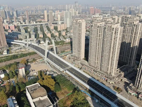 建安街(白沙洲大道—南湖路)工程在項目建設過程中,遇到大量征地拆遷、管線遷改等影響施工進展的“攔路虎”,項目在市城建局及洪山區(qū)的大力支持和指導下,通過組織協(xié)調(diào)、攻堅克難,及時有效地解決問題,為項目建設提供了有力保障。2021年8月17日、18日建安街上跨鐵路橋東主塔墩梁體 6#、7#墩轉(zhuǎn)體到位,在空中成功“牽手”,8月30 日主體結(jié)構(gòu)全線貫通,10月19日完成瀝青攤鋪。