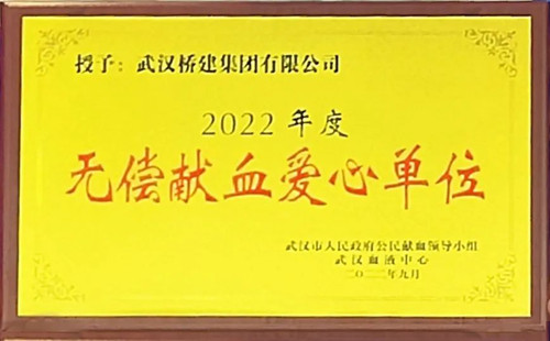 武漢血液中心授予公司“無償獻(xiàn)血愛心單位”榮譽(yù),感謝橋建集團(tuán)公司精心組織無償獻(xiàn)血公益活動,為患者帶去生的希望,為武漢市疫情防控和疾病救治作出了貢獻(xiàn)。