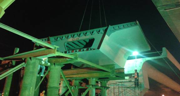 作為解放大道下延線改造工程的關(guān)鍵控制性工程漢黃路高架橋在經(jīng)過近半個多月鋼箱梁吊裝準(zhǔn)備工作后,在保證安全及交通組織完善的情況下,于2015年4月21日晚開始鋼箱梁吊裝。